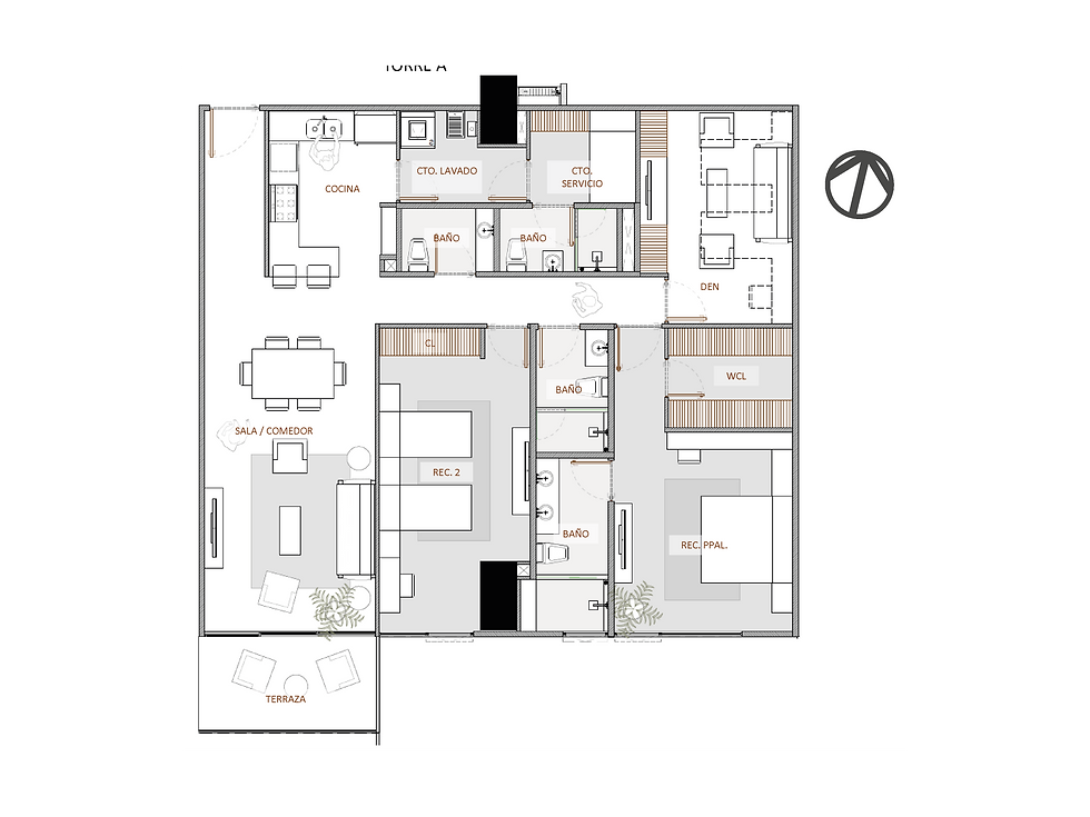 Este departamento de lujo de 168.71m² ofrece una distribución fluida y majestuosa en un piso, complementada por una terraza privada.